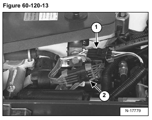 Disconnect the right switch handle connectors (Items 1 & 2) [Figure 60-120-13] from the loader wiring harness connectors.