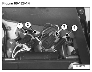 Disconnect the left switch handle connectors (Items 1, 2, 3 & 4) [Figure 60-120-14] from loader wiring harness connectors.