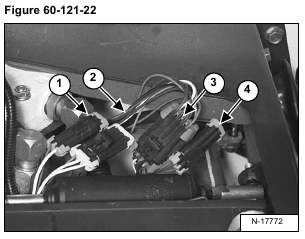 Disconnect the left switch handle connectors (Items 1, 2, 3 & 4) [Figure 60-121-22] from loader wiring harness connectors.