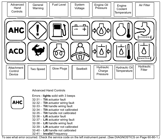 The Advance Hand Control System (AHC) has a built-in diagnostic function which uses an icon on the right instrument panel to indicate the condition of the AHC SYSTEM (W/PUSH BUTTON FLOAT). The system also records the alarm condition as a service code.