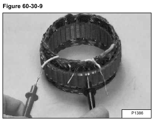 Posted on March 8, 2022 by Jack BobCat 753 – ALTERNATOR (55 AMP) – Stator Ground Test Touch one probe to a bare stator lead and the other probe to the bare metal surface of the stator [Figure 60-30-9]. There should be no continuity. Replace the stator if there is continuity.