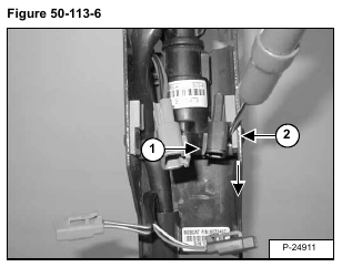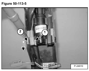 Using a small screwdriver, remove the electrical connector (Item 1) from the clip by pushing the connector down out of the connector clip (Item 2) [Figure 50-113-6].