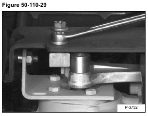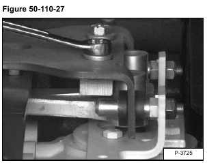 Loosen the nut (Item 1) a couple of turns, then loosen the bolt (Item 2). The bolt (Item 2) is threaded into the linkage bars (Items 3 & 4) [Figure 50-110-25].