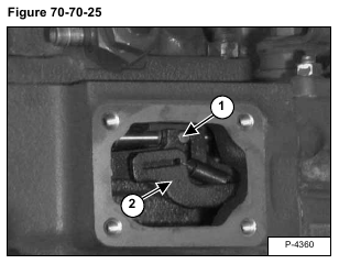Put the pin (Item 1) on the control rack in the slot of the fork lever (Item 2) [Figure 70-70-25] located inside the injection pump chamber.