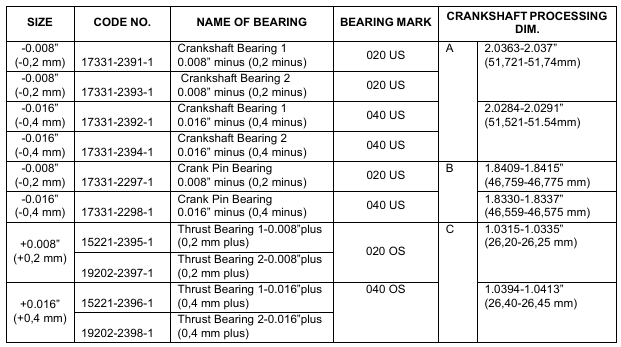 If the standard size bearing cannot be employed due to excessive wear of the crankpin and crank journal use undersize or oversize bearings.
