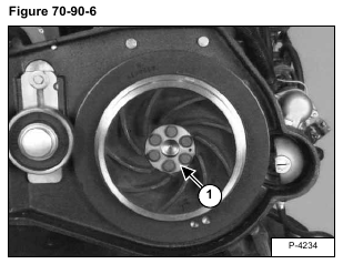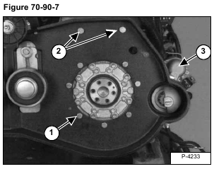 Remove the six flywheel mounting bolts (Item 1) [Figure 70-90-6] and remove the engine flywheel.