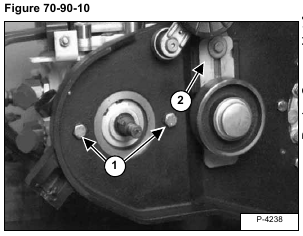 Remove the two mounting bolts (Item 1) [Figure 70-90-10] from the drive belt housing which mounts the hydrostatic pump to the housing. Support the pump to prevent it from falling when the mounting bolts are removed.