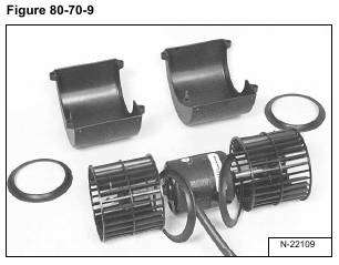 Remove the outside rings (Item 1) and fan wheel covers (Item 2) [Figure 80-70-8] from the fan motor and blower wheels.