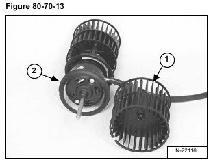 Remove the blower wheel (Item 1) and inside ring (Item 2) [Figure 80-70-13] from the blower fan motor shaft.