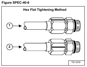Tighten the nut until it contacts with the seat. Make a mark across the flats of both the male and female parts of the connection (Item 1) [Figure SPEC-40-6].