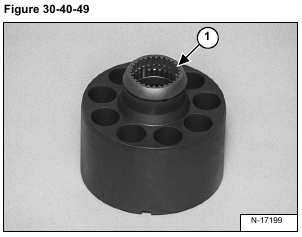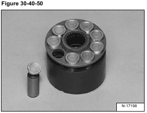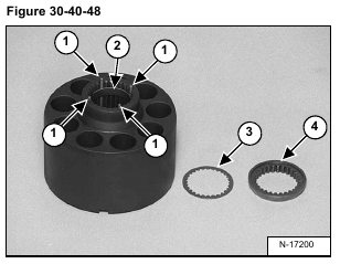 Install the four slipper pins (Item 1) into the cylinder block. Use the retaining ring (Item 2) [Figure 30-40-48]