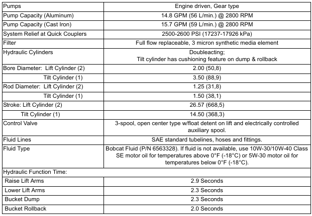 BobCat 753 – LOADER SPECIFICATIONS (753) – Hydraulic System