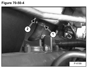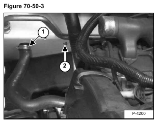 Loosen the hose clamp (Item 1) [Figure 70-50-4] from the right side radiator hose and disconnect the hose from the radiator.