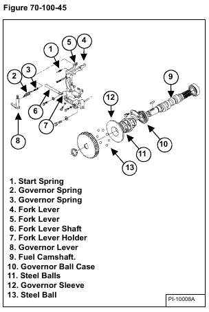 Disassemble and assemble the governor and fuel camshaft as shown in figure [Figure 70-100-45].