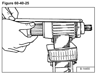 Armature Short-Circuit Test: Use a growler tester, put the armature on the growler and hold a hack saw blade against the armature core while slowly rotating the armature [Figure 60-40-25]. A short circuited armature causes the blade to vibrate and be attracted to the core. An armature which is short-circuited must be replaced.