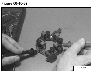 Brush Holder Insulation Test: Use a circuit tester, touch one probe to the positive brush holder plate and the other probe to the holder plate [Figure 60-40-32]. There should be no continuity. If there is continuity, replace or repair.