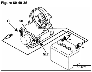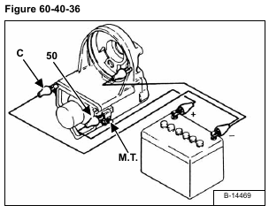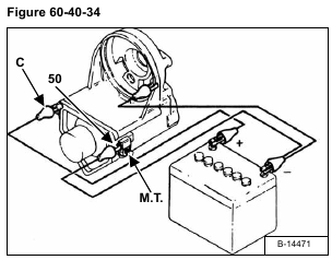 Pull-In Test: Connect the wires as shown in [Figure 60-40-34]. When connecting Terminal C and M.T. are closed, the pinion should engage.