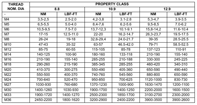 Posted on April 11, 2022 by Jack BobCat 753 – TORQUE SPECIFICATIONS FOR BOLTS – Torque For General Metric Bolts NOTE: Use the torque value for the part having the lesser property class when a fastener and nut are used together but have a different property class.