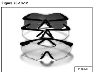 In addition to exercising caution in your work, DO WEAR SAFETY GLASSES OR A FACE SHIELD [Figure 70-10-12] when you are using R-134a or a leak detector, adjusting service valves or the manifold gage set connectors. Safety glasses or a transparent face shield are practical safety items and one or the other is absolutely required.