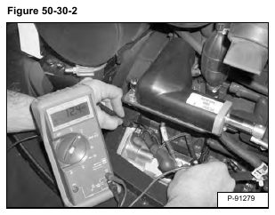 Start the engine and run at low idle. With a voltmeter, check the voltage between the B+ terminal and ground at the starter [Figure 50-30-2].