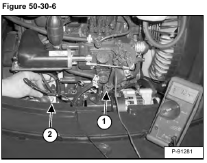Check the continuity between the โSโ terminal (Item 1) and the positive (+) terminal on the battery or starter terminal (Item 2) [Figure 50-30-6]. There should be continuity. If there is no continuity, replace the wire harness.