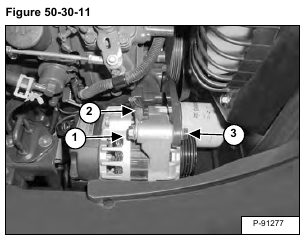 Remove the bolt (Item 3) [Figure 50-30-11] and remove the alternator.