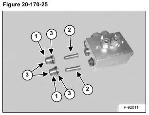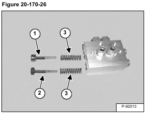 Remove the blade raise spool assembly (Item 1), blade lower / float spool assembly (Item 2) and springs (Item 3) [Figure 20-170-26].