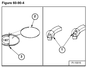 Installation: When installing new rings, assemble the ring so the mark (Item 1) near the gap faces the top of the piston. When installing the oil ring, place the expander joint (Item 2) on the opposite side of the oil ring gap (Item 3) [Figure 60-90-4].