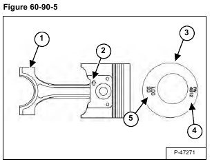 Installation: When reassembling, align the marks (Item 1) on the connecting rod and piston (Item 2). Heat the piston in clean engine oil to 80ยฐC (176ยฐF) and tap the piston pin into position. Place the piston rings so that there are gaps every 120ยฐ (Items 3, 4 and 5) [Figure 60-90-5] with no gap facing the piston pin in the cylinder.