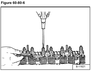 Put the correct size feeler gauge between the rocker arm and valve stem. Turn the adjustment bolt until the clearance is correct [Figure 60-80-6].
