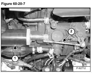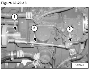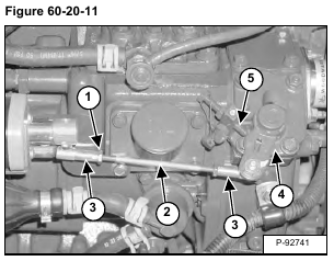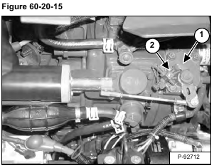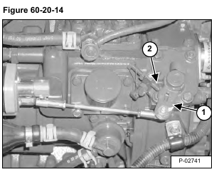 After the calibration procedure has been completed, with the engine off, turn the key to the ON position. Turn the engine speed control to the high speed position. The engine speed control lever (Item 1) must contact the stop (Item 2) [Figure 60-20-14].