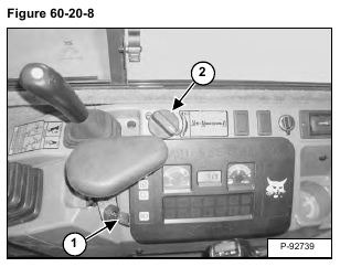 With the engine off, turn the key (Item 1) to the ON position. Rotate the engine speed control dial (Item 2) [Figure 60-20-8] to the high speed position.