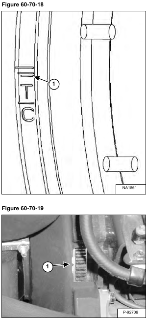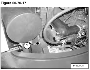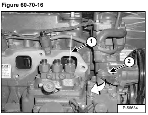 Continue to turn the engine slowly (for approximately one and three-quarter turns after fuel stops flowing from the injection pump nozzle), until the timing mark on the side of the flywheel (Item1) [Figure 60-70-18] is at the edge of the timing hole (Item 1) [Figure 60-70-19] in the flywheel housing.