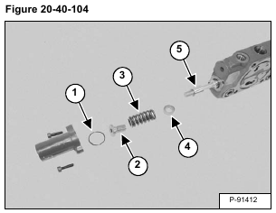 Remove the O-ring (Item 1), spring seat (Item 2), spring (Item 3) and spring seat (Item 4) from both ends of the valve. Remove the spool (Item 5) [Figure 20-40-104].