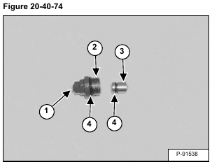 Remove the adjustment screw (Item 1) and lock nut from the valve body (Item 2). Remove the poppet (Item 3) from the body (Item 2). Remove the O-rings (Item 4) [Figure 20-40-74] from the poppet and the body.