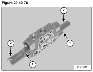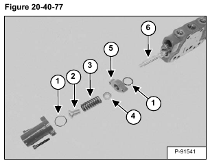 Remove the O-rings (Item 1), spring seat (Item 2), spring (Item 3), spring seat (Item 4) and spacer (Item 5) from both ends of the valve. Remove the spool (Item 6) [Figure 20-40-77].