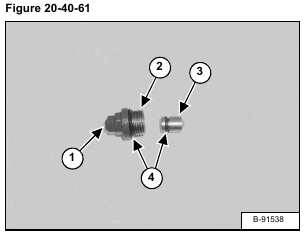 Remove the adjustment screw (Item 1) and lock nut from the valve body (Item 2). Remove the poppet (Item 3) from the body (Item 2). Remove the O-rings (Item 4) [Figure 20-40-61] from the poppet and the body.