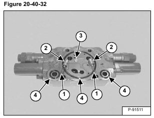 Remove the spring (Item 1), poppets (Item 2) and shuttle valve (Item 3). Remove the O-rings (Item 4) [Figure 20-40-32].