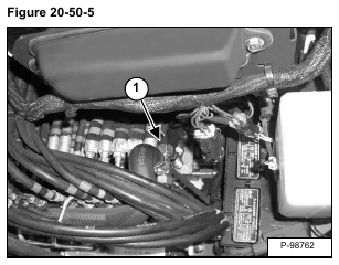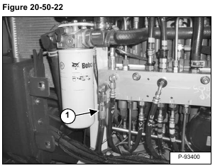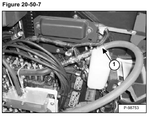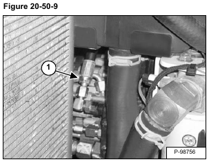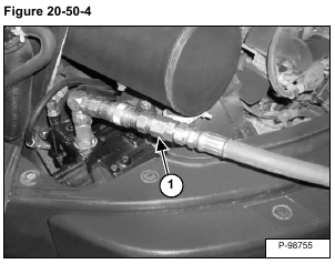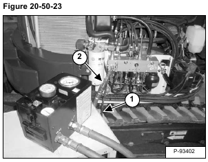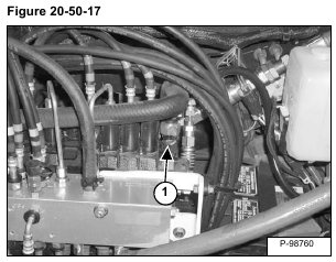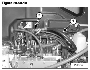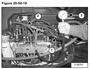Install the jumper hose with the tee fitting (Item 1) on the hydraulic control valve outlet test port and on the adapter hose (Item 2) [Figure 20-50-10].