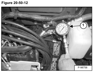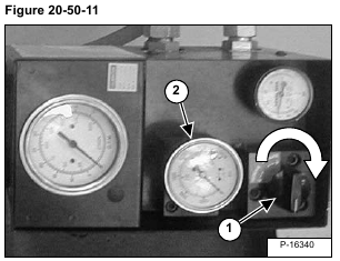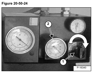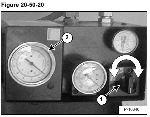 Install a 3447 kPa (34,5 bar) (500 psi) gauge on the hydraulic control valve test port (Item 1) [Figure 20-50-12].