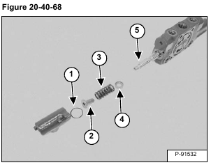 Remove the O-ring (Item 1), spring seat (Item 2), spring (Item 3) and spring seat (Item 4) from both ends of the valve. Remove the spool (Item 5) [Figure 20-40-68].