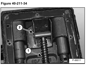 Install pressure spring (Item 1) on the spring guide. Tilt the bearing block and pivoting journal (Item 2) [Figure 40-211-34] down and install on the spring guide.