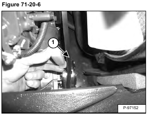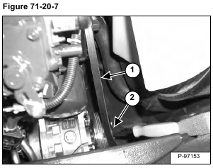 Use a pry bar (Item 1) [Figure 71-20-6] to push the belt off of the pulley. Using a pry bar on the flywheel, rotate the engine by hand to push the belt off the crankshaft pulley. Continue to rotate the flywheel until the belt is loose. Remove the belt.