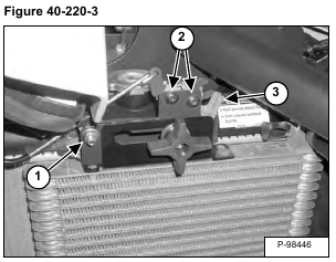 Remove the nut, bolt and clamp (Item 1). Remove the bolts and nuts (Item 2) and remove the latch (Item 3) [Figure 40-220-3].