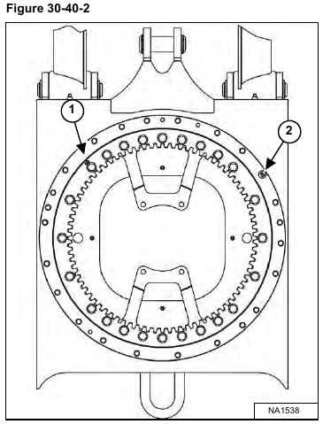 Install the swing bearing so the inside soft zone (Item 1) is at the left hand side of the excavator and the outside soft zone (Item 2) [Figure 30-40-2] to the right side of the excavator.