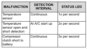 When the EDT detects an open or short from the temperature sensor, the status LED (Item 1) [Figure 70-90-1] will blink once per second and the output signal to the clutch will be turned off. The status LED will flash two times per second when EDT detects an open circuit (current draw less than 200 mA), short circuit or over current (current draw greater than 7A) from the clutch output. The status LED will flash three times per second when the compressor clutch is shorted to ground.