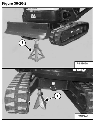 Raise the blade fully and install jack stands under the blade and track frame (Item 1) [Figure 30-20-2]. Lower the boom until all machine weight is on the jack stands.