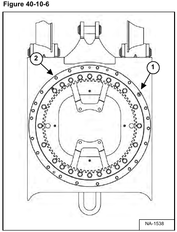 Rotate the swing bearing so the outside soft zone (Item 1) [Figure 40-10-6] is to the right hand side as shown.