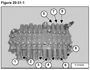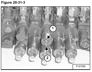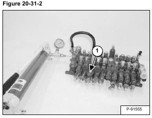 Install the hand pump hose and a 34474 kPa (345 bar) (5000 psi) pressure gauge into the valve section work port in which the port relief valve is located [Figure 20-31-2].