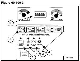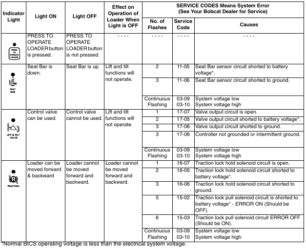 The following chart shows the effects which can happen to the loader, and the probable causes when the BICS Instrument Panel lights are off. See [Figure 60-100-3] for location of BICS lights and Icons. Have service procedures performed ONLY BY QUALIFIED BOBCAT SERVICE PERSONNEL.